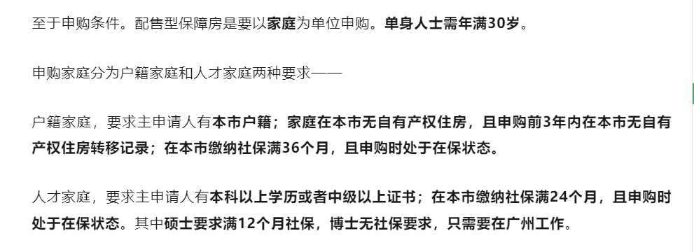 首先作为人才房,可不是随便就能买的,和前段时间推出的配置型保障房申购条件一样,得拥有广州户籍、本科以上学历、且名下无房产,详细情况如下: