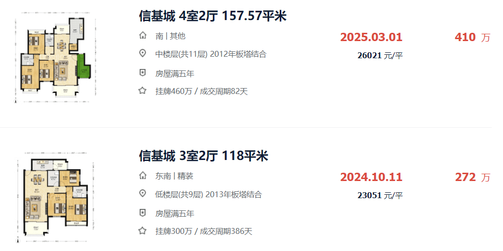 而对比不远的信基城,小区均价为3.1万/平,近期成交价则在2.3-2.9万/平。