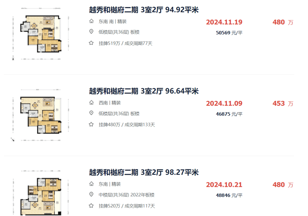 再来看近期成交价,越秀和樾府二期成交单价在4.6-5万之间,也低了不少。