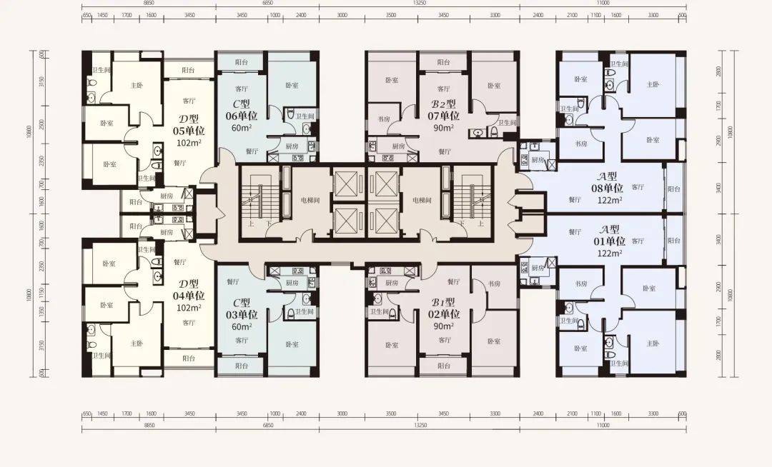 户型布局方面,项目涵盖建面约60平1房、90平3房、102平3房、122平4房,四梯八户,楼栋的详细布局如下: