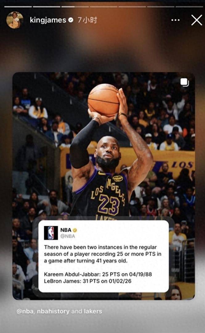 这场比赛詹姆斯创下的远不止一项纪录。 他以41岁后总得分48分(生日夜17分加上本场31分)超越贾巴尔的47分,成为该年龄段总得分最高的球员。