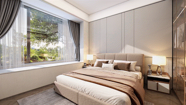主卧可以轻松放置1.8米的床+两个床头柜,窗墙比是非常大气的,它意味着透光的面积越大,家里就会越明亮,且建筑立面的质感会更好,视野景观也会更加清晰。