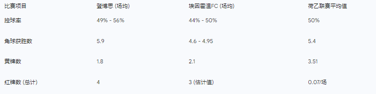登博思在主场展现出了较强的压迫力,场均5.9个角球远高于联赛平均水平,这主要源于其边路传中战术的执行 。然而,高控球率并未转化为稳固的防守,其场均失球数仍维持在1.85的高位 。埃因霍温FC的纪律性相对较差,场均2.1张黄牌反映了其在中场区域通过强硬身体对抗打断对手节奏的战术偏好 。