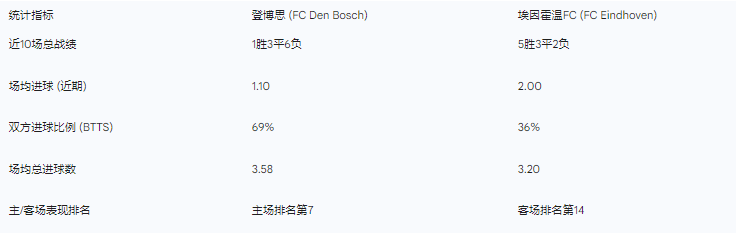 从历史交锋(H2H)来看,埃因霍温FC占据了心理上的绝对优势。在两队过去的15次交手中,埃因霍温FC赢得了其中的10场 。尽管在2025年11月的最近一次对决中,登博思曾在客场以3比1取胜,但这被广泛认为是当时埃因霍温FC状态低迷期的孤立事件 。