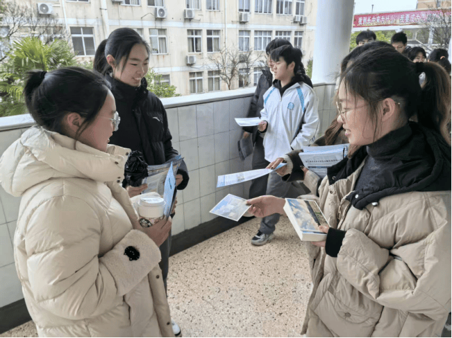 2026年2月6日下午,团队成员在长兴中学门口准时集合并拍摄集体合影。随后前往学校指定的宣讲教室,有序开展场地布置工作。团队在教室外悬挂浙江海洋大学宣传横幅,营造浓厚的宣讲氛围。成员朱静琰和李清芳为到场的学弟学妹有序发放宣传册、明信片、文件夹等宣传物料,做好宣讲前的各项准备。