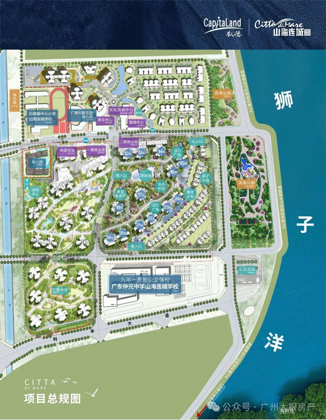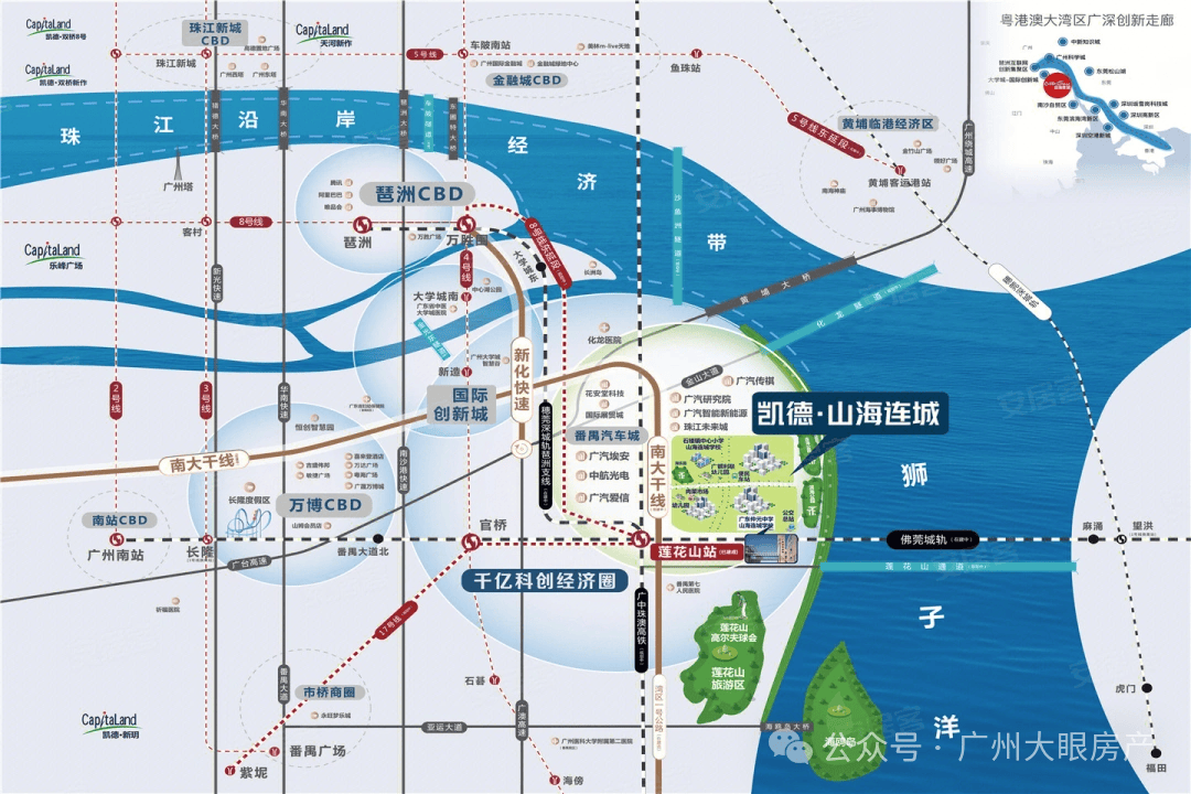 凯德山海连城,位于广州市番禺区莲花湾板块,紧邻南大干线,交通便利。项目东临狮子洋、南望莲花山, 邻近广州大学城、万博CBD、思科智慧城、广汽研究院及莲花山高尔夫球会等高端城市资源配套。
