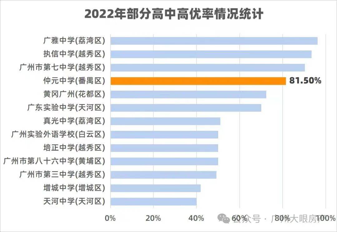 聚焦2022年最新数据,仲元中学的高优率已经达到了81.5%,600分以上考生接近200人,遥遥领先于其他常出现在广州家长口中的学校。