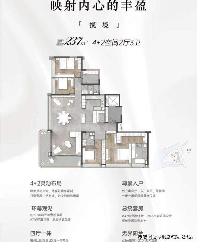 户型设计太惊艳啦!产品为 180/237 平大平层,两梯两户设计,专梯入户,私密性超好。空间宽敞,LDKG 一体化设计,让生活空间更加开阔舒适。237㎡户型更是拥有 270° 巨幕阳台,采光和视野极佳,不仅能饱览莲花湾中心湖的美景,还能享受充足的阳光,无论是家庭聚会还是休闲独处,都能拥有绝佳体验,满足对高品质生活的追求。