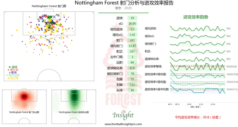 再看诺丁汉森林这边,处境就比较艰难了,现在排在第17位,刚好在降级区边缘。他们最大的问题是客场不给力,不仅近6个客场只赢了2场,更要命的是自1994年以来,客场对阵维拉就没赢过,30年的不胜魔咒摆在这里。而且球队伤病情况严重,主力后卫博利、中场桑加雷还有前锋阿沃尼伊都伤缺了,攻防两端都受影响。进攻端更是拉胯,本赛季已经有10场联赛没破门,得分效率在英超排倒数,近6场联赛也只赢了2场,状态低迷得很。